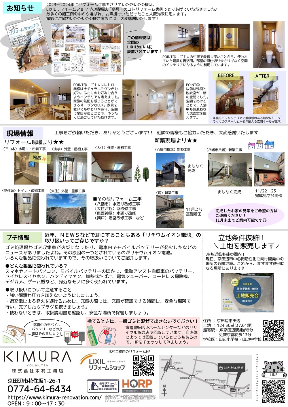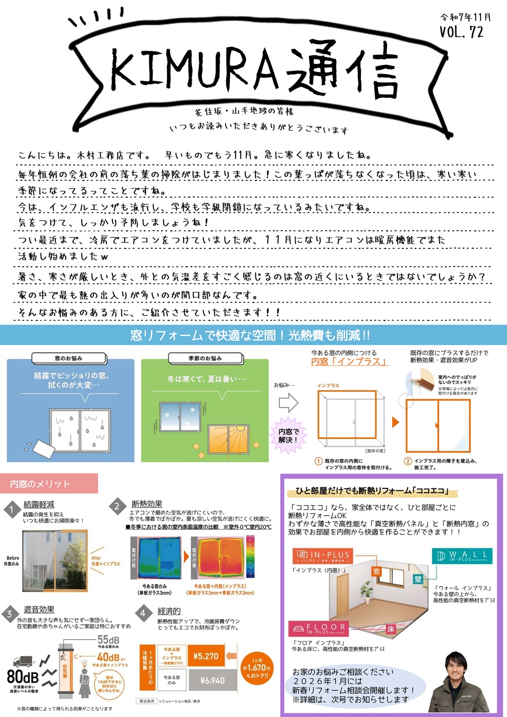 今月のKIMURA通信のおもて面は、これから寒さが厳しくなったときにおすすめのリフォーム工事をご紹介しています!