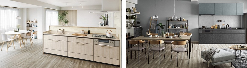 共通仕様として扉の納まりがリシェルと同一の納まりに変更してすっきりとしたデザインに統一され、人気のフロントオープン食器洗い乾燥機も綺麗に納まります。