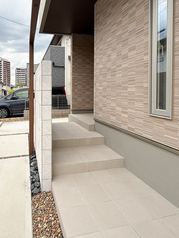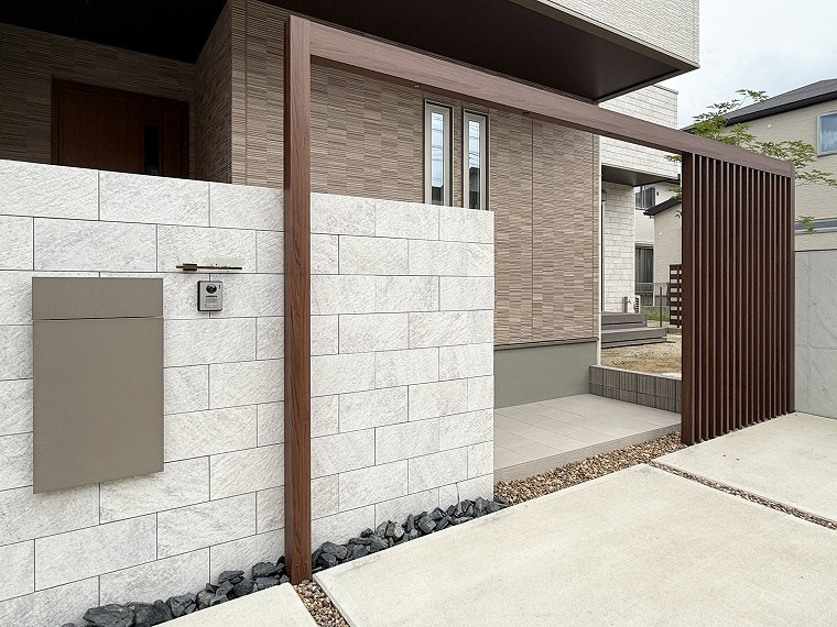 〈商品〉入口:プラスG格子タイプ(LIXIL)クリエモカ / 宅配ボックス:KN / タイル:ストーンタイプコレクション(LIXIL)