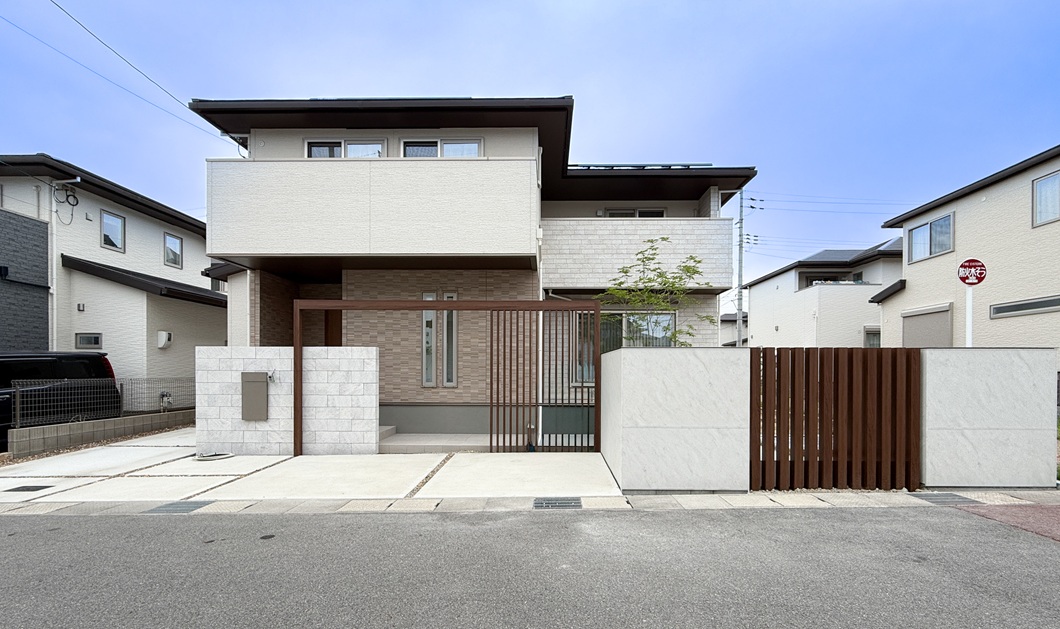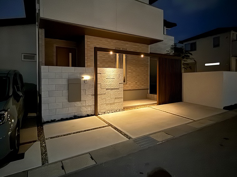 日が落ちたあとの、ライトアップされた外構も品があります。外構が変わるとお家の印象もかわり、素敵な外構が完成しました。
